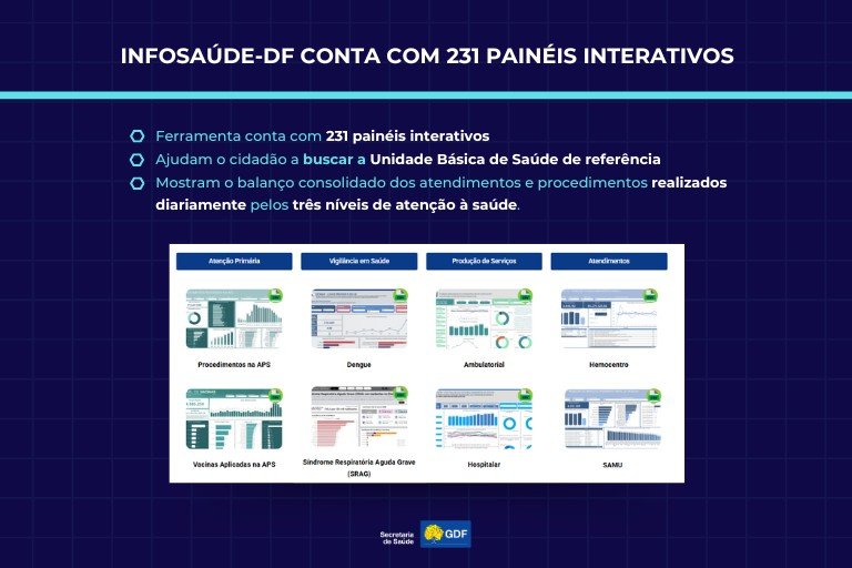 Atualmente, estão em funcionamento 231 painéis. Desse total, 89 compõem o menu da Sala de Situação de Saúde do DF – seção destinada a fornecer um balanço consolidado dos atendimentos e procedimentos realizados diariamente pelos três níveis de atenção à saúde.