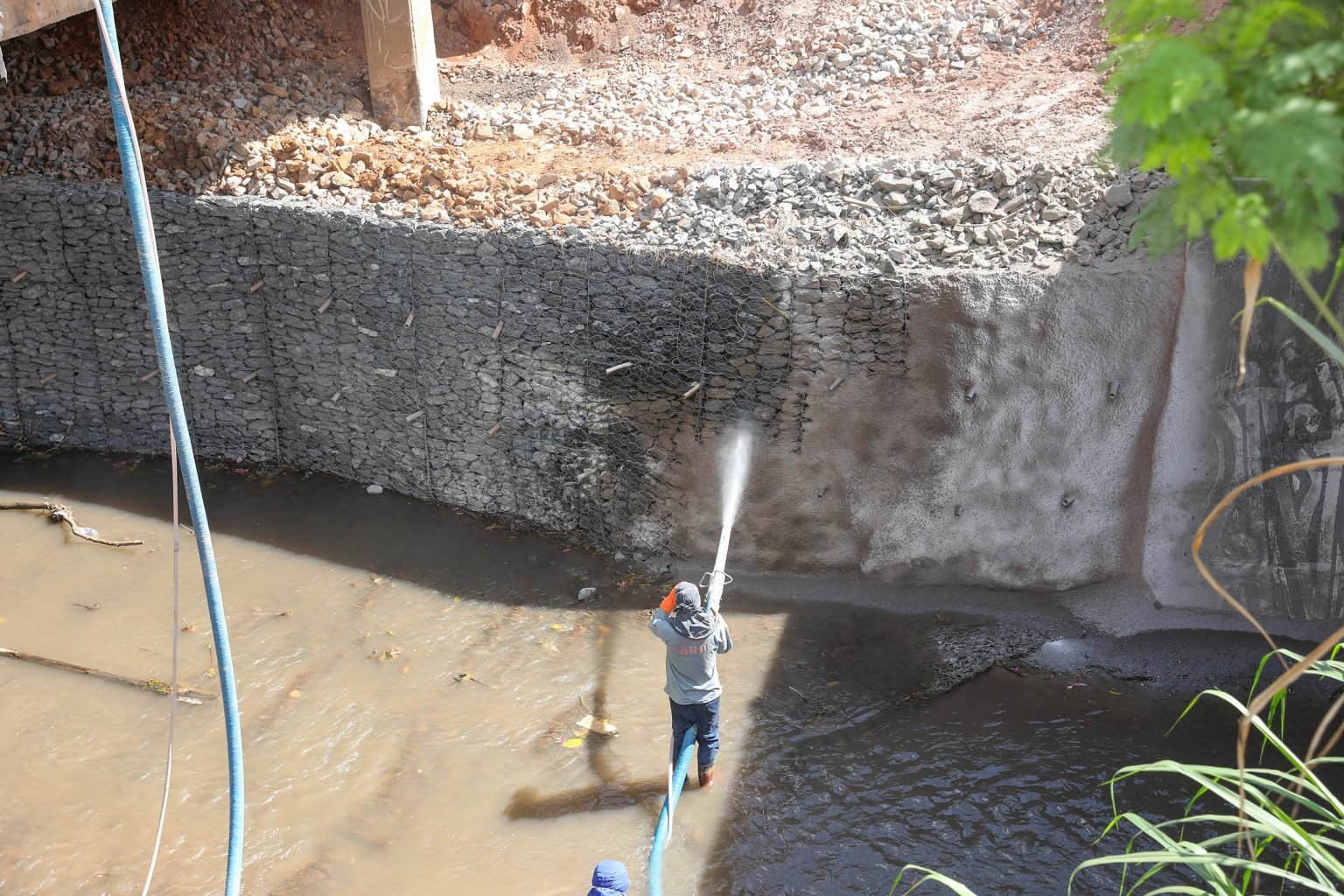 “A gente está jateando concreto na superfície externa do muro de arrimo que fica virado para o lado do córrego, justamente para dar mais proteção no próximo período chuvoso, quando o nível da água do córrego se eleva. E isso, consequentemente, vai proteger o aterro de um possível desmoronamento no futuro”, explicou Jarbas da Silva, engenheiro do DER-DF.