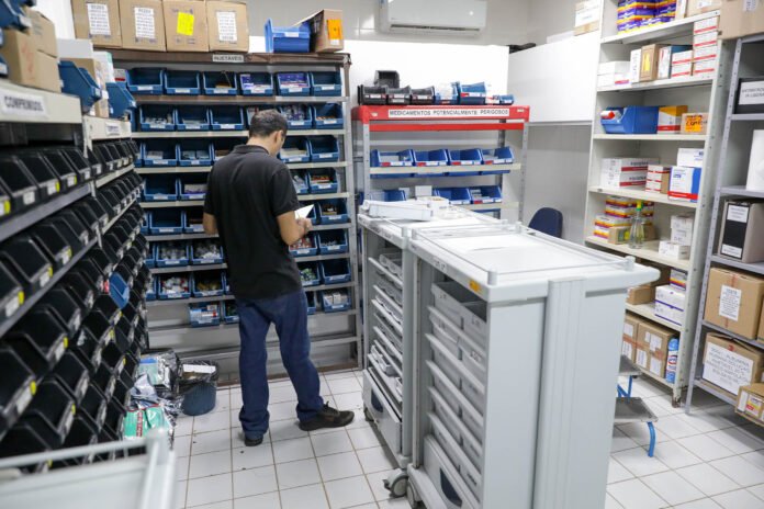 “Hoje, no espaço criado em 2019 funciona o centro de distribuição de materiais e medicamentos, ou seja, o local onde sai tudo que é usado nas clínicas: desde itens básicos, como agulhas, seringas, curativos e algodão, até materiais cirúrgicos e sondas”, detalha. “Já o novo espaço, criado em 2023, é a farmácia das doses, que recebe os medicamentos para fazer a separação individualizada.”